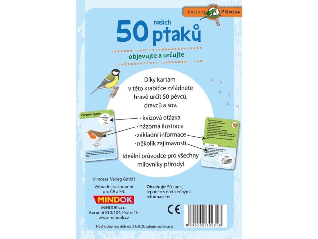 V krabičce jsou obsaženy karty díky nimž zvládnete hravě určit 50 pěvců, dravců a sov. Na kartách najdete kvízovou otázku, názornou ilustraci, základní informace a také několik zajímavostí.