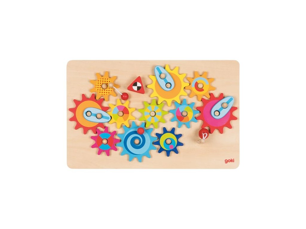 Hra s ozubenými kolečky Roztoč mě XL GOKI. Vyrobeno ze dřeva a překližky. Barveno nezávadnými barvami.